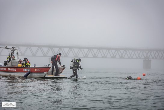 Insgesamt nahmen 13 Einsatztaucher an der Übung teil, davon acht im aktiven Wassereinsatz. Unterstützt wurden sie durch zwei Arbeitsboote der Feuerwehren Braunau und St. Peter, sowie das Rettungsboot der Feuerwehr St. Peter.